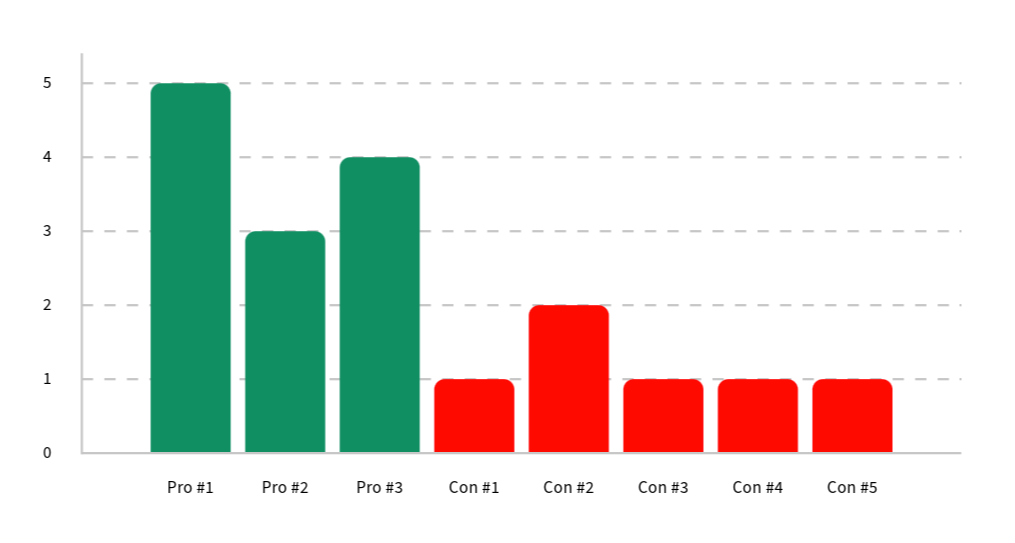 Instead, visualize the results. For example, create a bar chart that displays the level of importance from 1 to 5 (as in #1 above) for each pro or con. As you can see in the chart below, while there are more cons, their importance is relatively insignificant compared to the pros. Visualizing this information into graphic form makes this more immediately obvious.